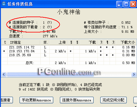 我们在 “查看任务的传送信息”时可以看到“连接到的种子”和“连接到的下载者”数目,但是总数目都显示为“?”无法获得。对于当前连接到的下载者的IP地址、上传下载速度和下载的块数等信息可以准确的获得。
