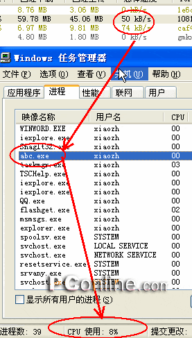 经过测试几个下载任务在总体(上传/下载)速度为(50+74)K/S时,CPU的占用率不超过10%(图6),占用率对计算机的操作速度影响很微。