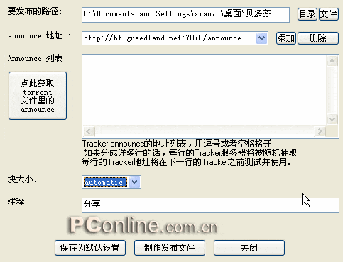 我们可以用贪婪BT制作torrent文件,使贪婪的torrent制作工具总的感觉还是比较简单,只需指定一个要分享的文件夹,然后输入发布页面的地址(图5),同时还可以自定义选择块的大小。