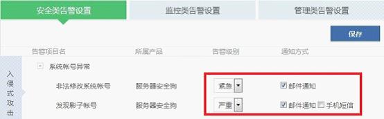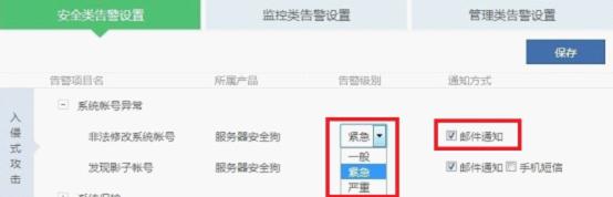 3、对于“严重”级别的告警项目,服云提供邮件及短信两种告警通知方式,对于“紧急”、“一般”级别的告警项目,服云只提供邮件告警通知方式,如图所示: