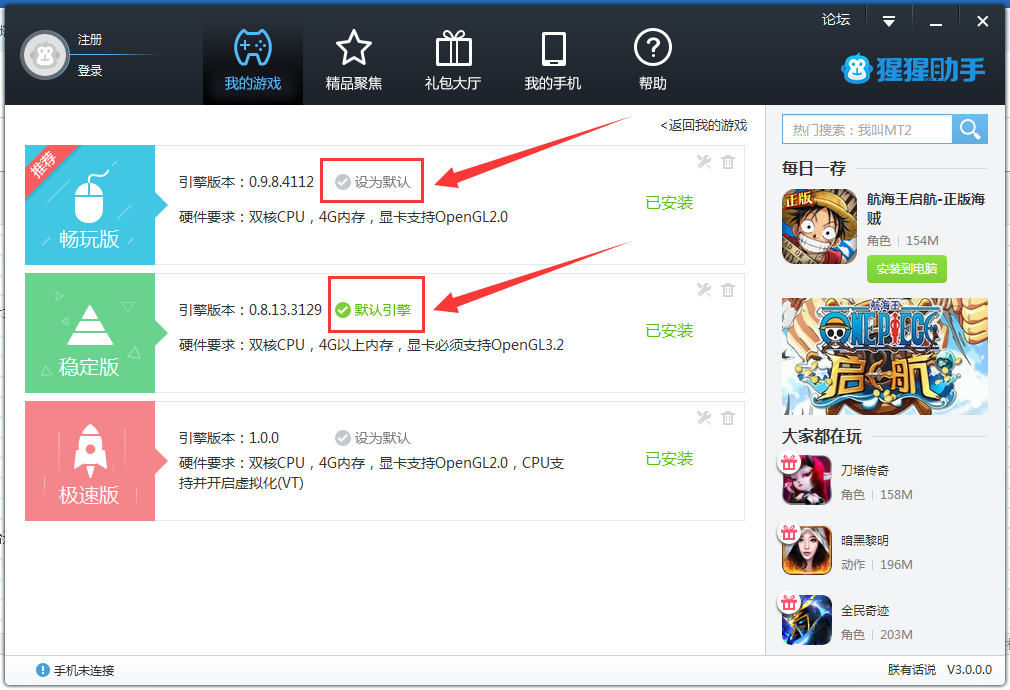 3、两个引擎安装好之后,就可以往2个引擎上添加游戏了,设置当前默认引擎,安装游戏即可安装到指定的默认引擎上。
