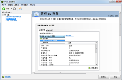 3. 桌面右键选择NVIDIA控制面板(对应选择自己的独显配置软件) > 3D设置 > 全局设置 >始终使用高性能NVIDIA显示适配器,点击“应用”后生效。