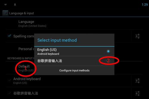 2. 点击“default”,接着选择"谷歌拼音输入法"。