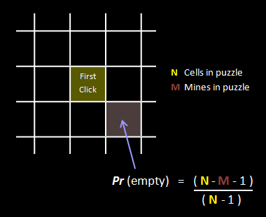 类似地,当前场上还剩 N-2 个格子和 M 个雷,所以下一个格子依然不是雷的概率是 (N-M-2)/(N-2)。依此类推,最后可以发现,第一次点击的格子,其周围没有雷的概率是
