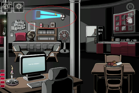 5.你可能发现了,那个钥匙不是门的钥匙。不要急,电扇上面有一盏灯,用手碰一下发现灯的方向是会变得。让灯光横过来,光里出现了一个小点,把刚拿到的钥匙放上去,它的影子被印了出来。