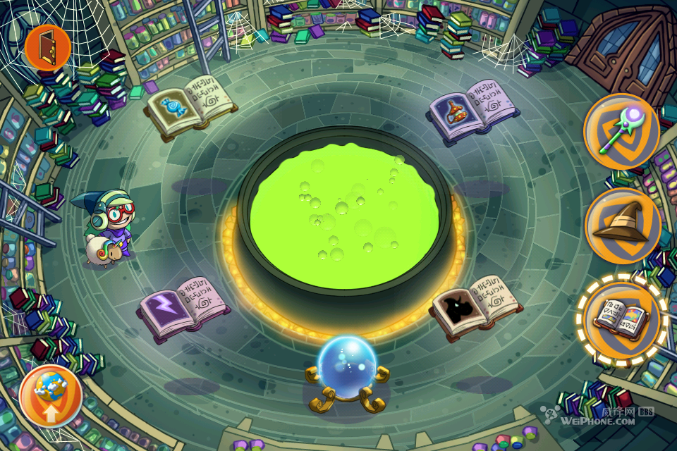 魔咒一共有四个,左上的double candy spell,意思是得到这个魔咒之后,你每买一个糖果,他会给你两个,也就是double了嘛。右上是double soda spell,意思是你得到这个魔咒之后,在游戏里每次得到一个soda,他也会给你两个,也是double了,而且soda的槽上升到8个槽。左下的magic protection spell,得到这个魔咒之后,每次战斗(也就是泡泡龙),他允许你越线一次,功能类似植物大战僵尸的推车。。右下summon epic dragon,每次在地图上走来走去是不是很烦而且浪费时间?有了这个,你会驯服一条龙(就是epic dragon),以后就不用在地图上一格一格走了,可以飞!