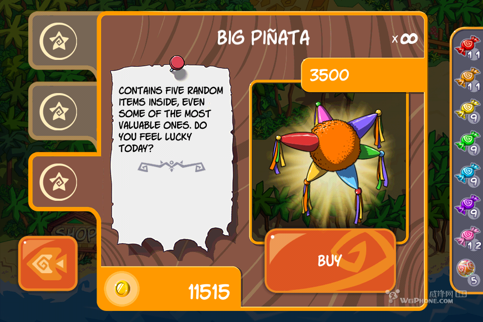 坑爹商人的店里除了token还有两个东西,一个是个彩色的马叫little Pinata,还有一个长的很奇怪的是big Pinata,这两个pinata也是西班牙语,n上面有一个~,我键盘打不出来哈。意思百度了一下。。貌似是礼物彩罐?类似彩蛋的存在吧。。