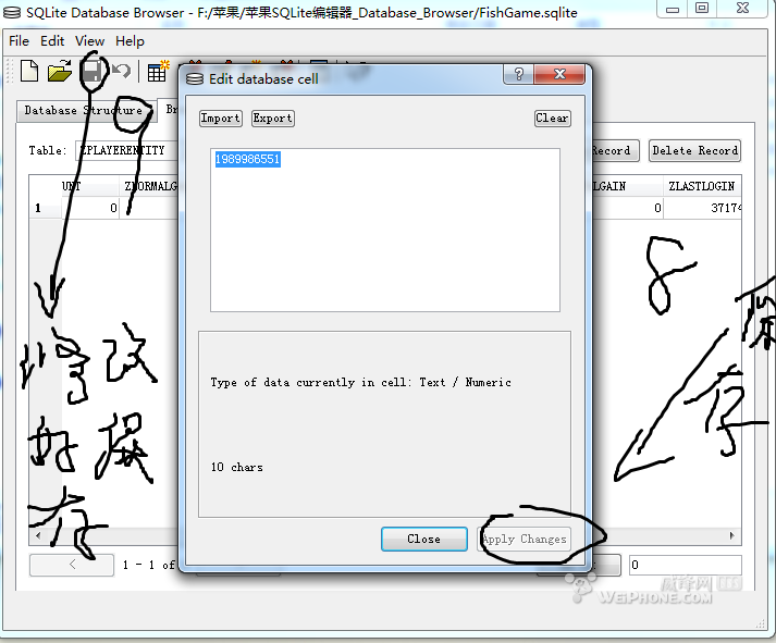 方法:先在手机上结束游戏,后台也关掉-----用iTools打开捕鱼达人存档导出-----用SQLite_Database_Browser修改器修改存档在导入即可(最后一个图有19亿的修改数值)对应数值修改即可、别说看不懂。。。。