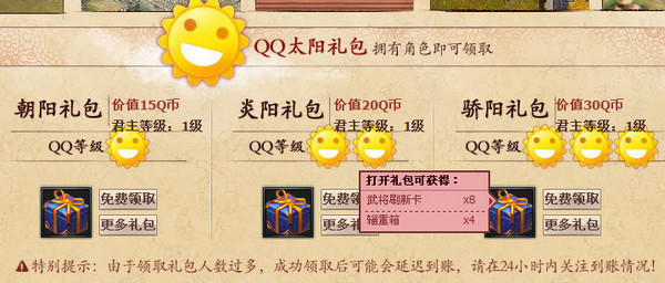 骄阳礼包(QQ等级3颗太阳可领取):武将刷新卡*8、辎重箱*4。