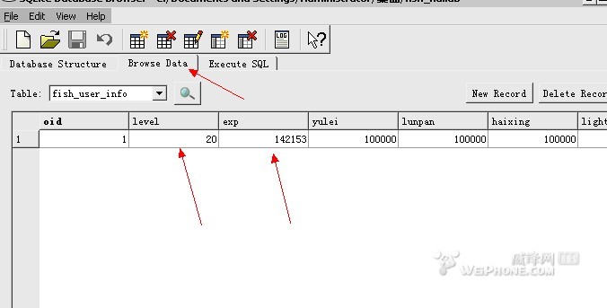 3.点SQLite Database Browser软件的Browse Data,就能看到数据了。level等级,exp钱,后面四个是转盘,导弹等。