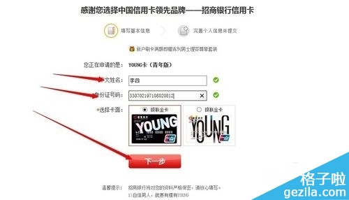 4、输入姓名,身份证号,选择卡种,点击”下一步“,