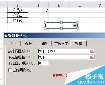 4、右击组合框控件,在弹出的快捷菜单中选择 设置控件格式 ,弹出 设置对象格式 对话框,选择 控制 选项卡,将 数据源区域 设置为 $I$1:$I$3 ,将 单元格链接 设置为J1单元格,这样在组合框中选择某个系列名称时,J1单元格中就会显示相应的数字。