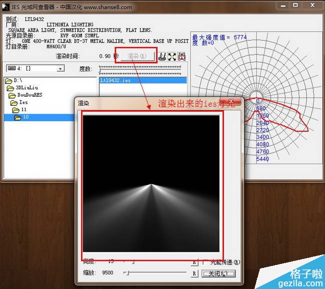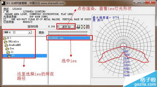 在很多时候,我们拿到光域光文件后,但我们不知道该光域网的形状,这时我们就要用到该软件,使用方法:选择光域的存放路径然后再选择光域网文件,这时右边就会出现这光域网的形状,也许你还看得不是很清楚,不急,我们还会可以渲染。 如图三。