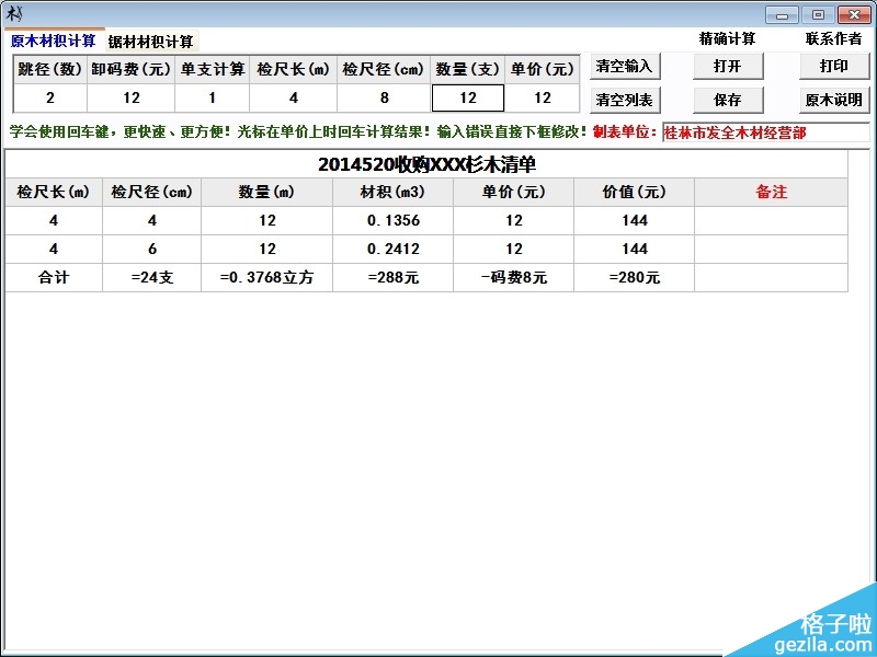 7、单支计算:价格=数量*单价,不按材积立方计算价格,在单支计算中输入1或0则按单支计算价值,输入其他都是按材积立方计算价值,当然材积还是计算在总材积内的;(如:当在单支计算输入1时,数量输入8;单价输入20;那么回车后下表框价值显示为160);
