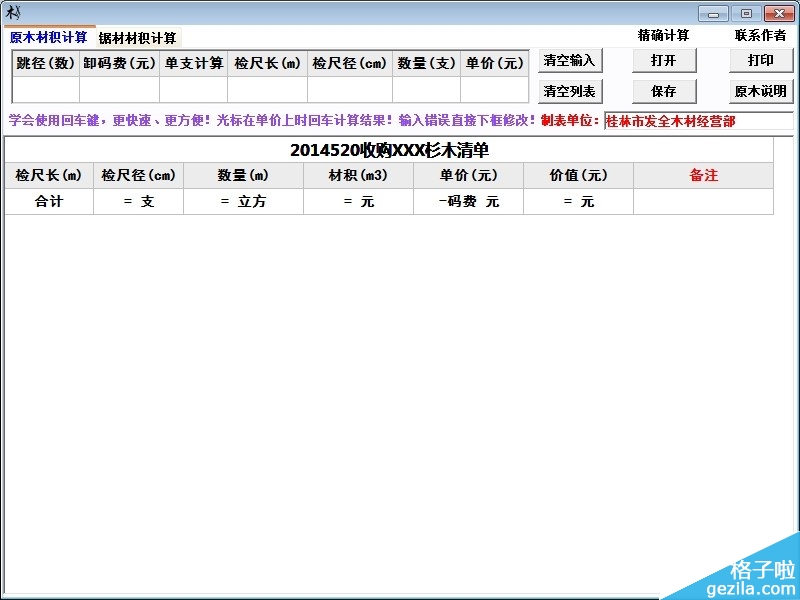 1、本软件仅适用于计算检尺长2~10米,检尺径4CM以上和单支/元的计算;