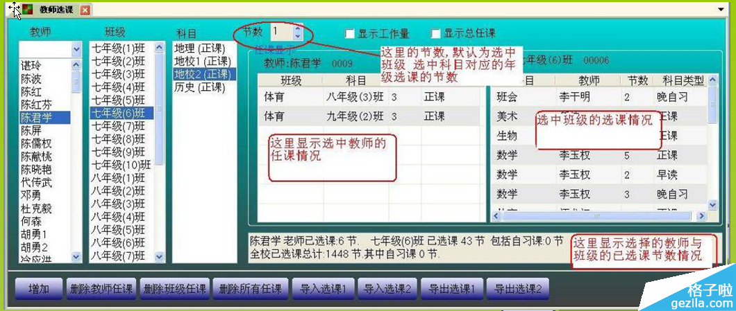 增加任课:在列表框中选中相关教师 班级 科目,并设置好节数按"回车"或者点击