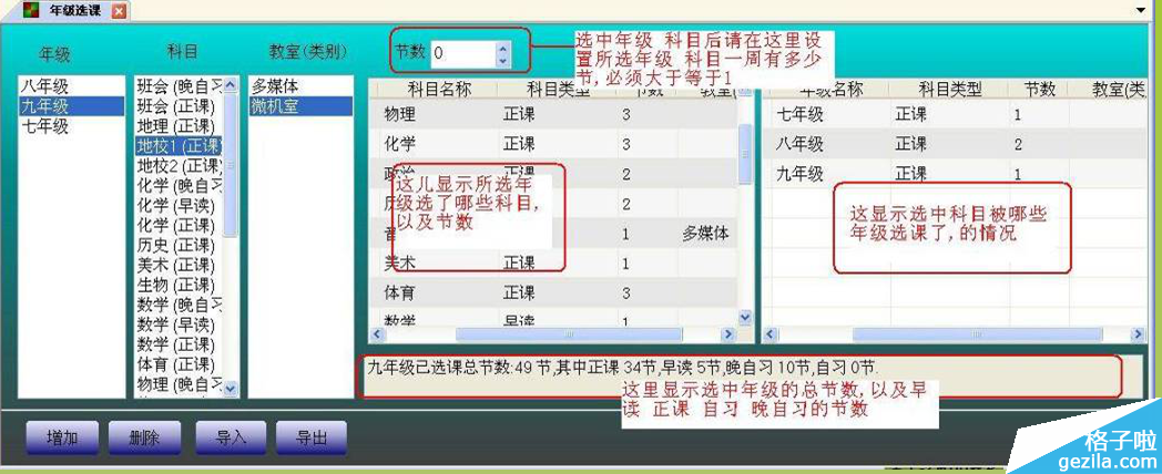 增加年级选课:必须同时选中某个年级 某个科目 并设置好一周的节数。按“回车”或者点击【增加】按钮。