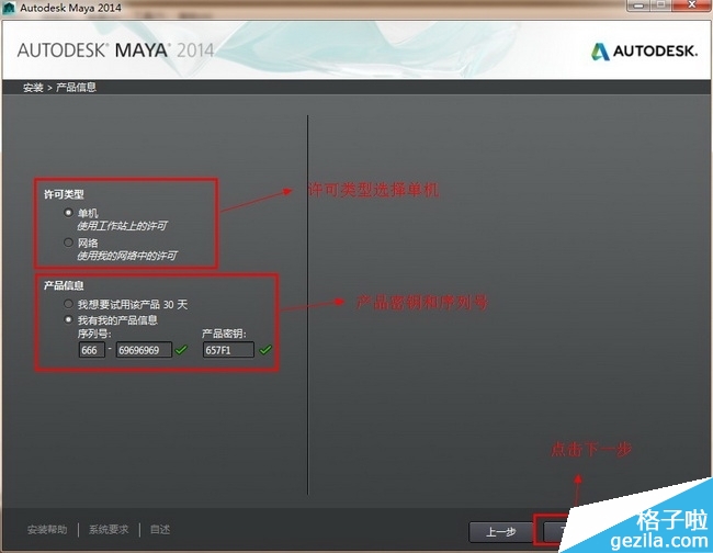 (图五)许可类型选择“单机许可”,maya2014序列号是:666-69696969,产品密钥是:657F1(产品密钥最好是手动输入)。点击下一步。 如图五。