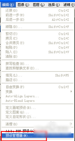 打开photoshop,选择编辑/预设管理器,打开预设管理器面板,如图: