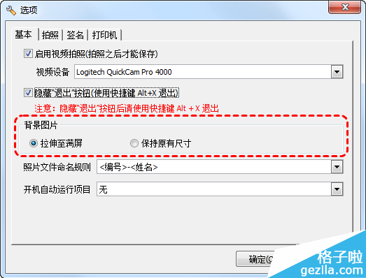 4、软件支持使用BMP或者JPG格式(对于JPG格式的图片要求图像模式是RGB模式,如果图片模式是CMYK,请使用photoshop软件更改图像模式)的图片文件作为签到背景图片,默认情况下软件自动缩放背景图片至满屏显示,如果想以图片的原始尺寸显示,请在“选项”窗口中设置,如下图所示:
