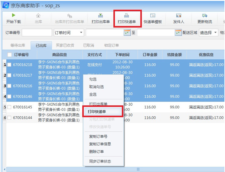 1、登录商家助手客户端,通过右键菜单和主页面“打印快递单”按钮打印