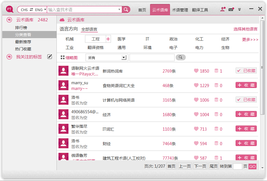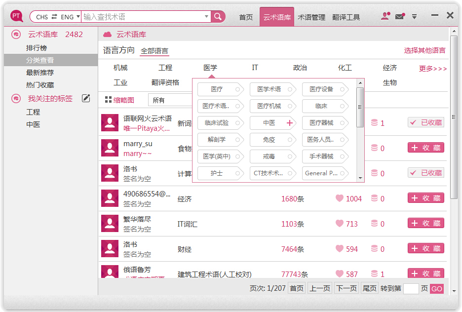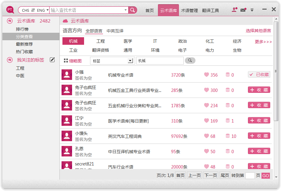 点击热门标签将显示包含该标签的所有共享术语库。点“更多”可查看更多标签。