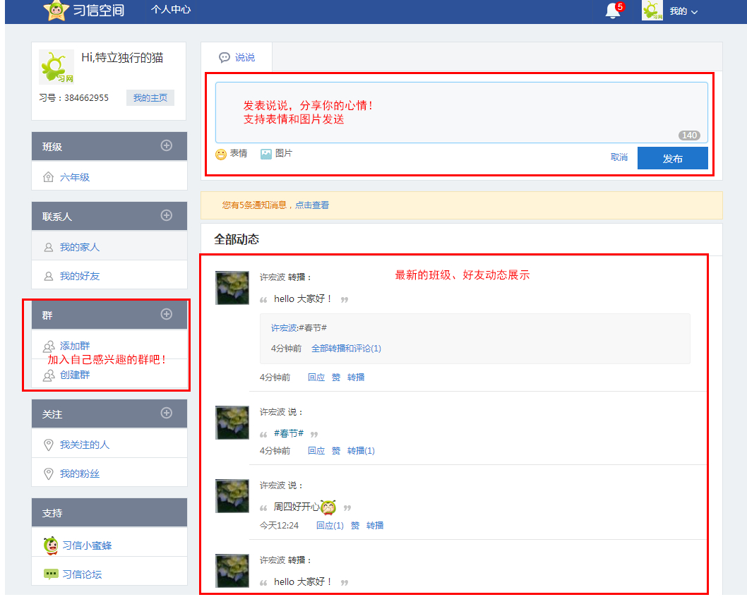 当然除了学习,交流,我们还可随意发表自己说说,分享自己的世界。