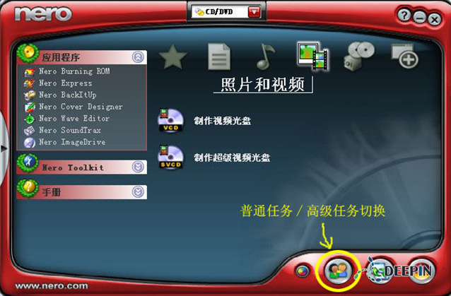 2、选择“照片和视频”,注意这时候并不出现刻录DVD视频的选项,因为这个功能默认是隐藏的,在界面右下角有四个按钮,点击“在标准任务和高级任务之间切换”按钮,就会出现“刻录DVD视频文件”项。点击。