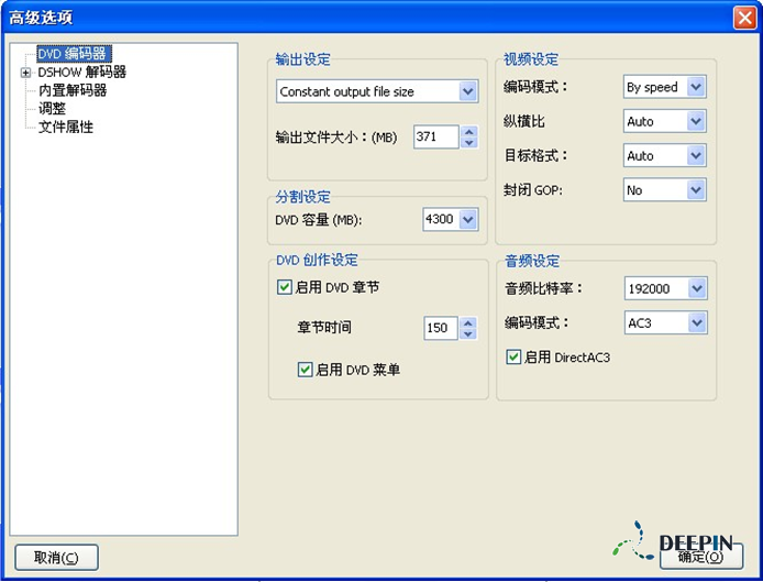 需要注意的是如果你的源文件过大,所产生的DVD文件可能会超出你DVD盘片的容量(一般为4.7G),需要改变输出文件的大小点“高级”按钮,出现如下窗口,