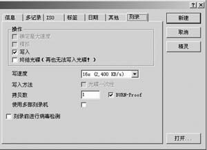 “拷贝数”可设定刻录光盘的数量。在紧挨着“拷贝数”的地方通常会有一个可选项,这里主要是对应于一些防刻死技术的选项。如果刻录机可支持这些功能,相应的功能选项就会打开,需要在这个位置打上对勾才能够使对应的刻不死技术生效。