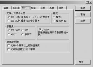 “文件-/目录名长度”:ISO 1级的文件名和目录名最多只能使用11个字符,也就是不支持长文件名,要放宽这个限制就得选择“ISO 2级”,这样我们就能使用长文件名了。