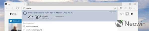 Cortana也可以这么用:在地址栏输入Weather可以查询当前的天气,等等使用场景。