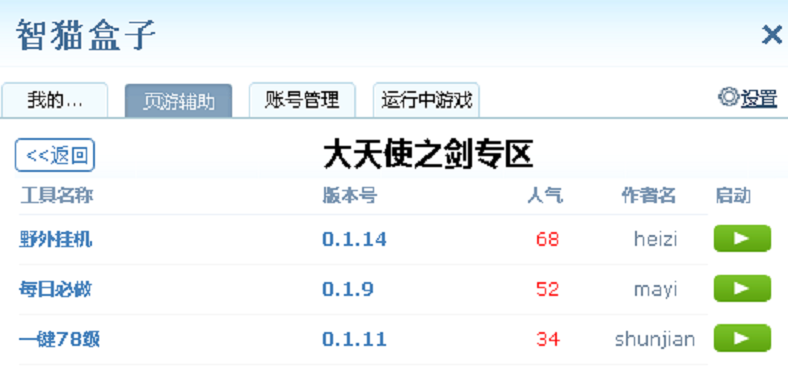 第三:点击游戏专区(如:大天使),选择您需要的辅助,点击绿色的“启动”按钮