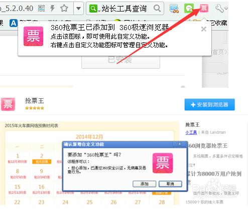 第二步:点击图标后,根据提示安装“抢票王”,在浏览器的有上角出现图2提示和一个“票”图标,安装完成