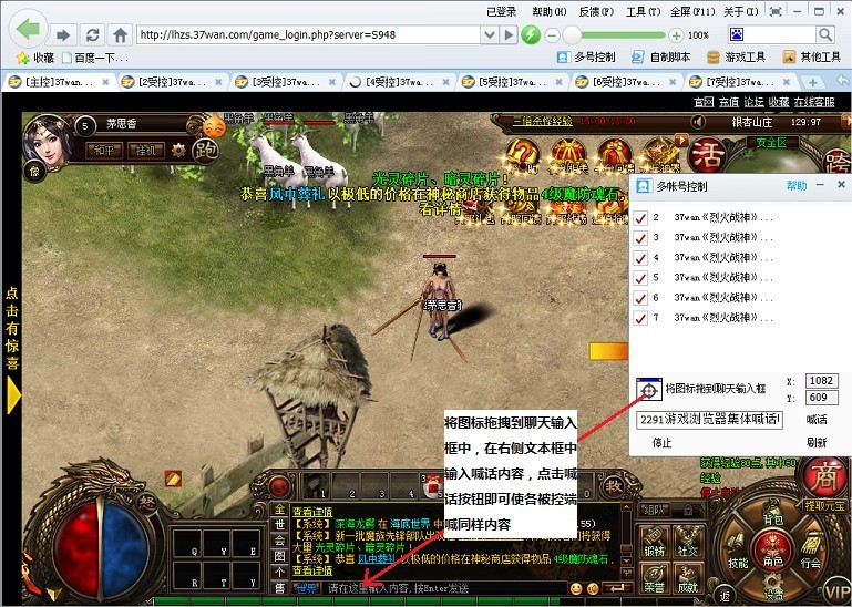 第五、多号喊话:开启多号控制后,将定位图标拖拽到聊天窗口输入框中,在右侧文本框中输入喊话内容,点击喊话按钮即可多账号一起喊话