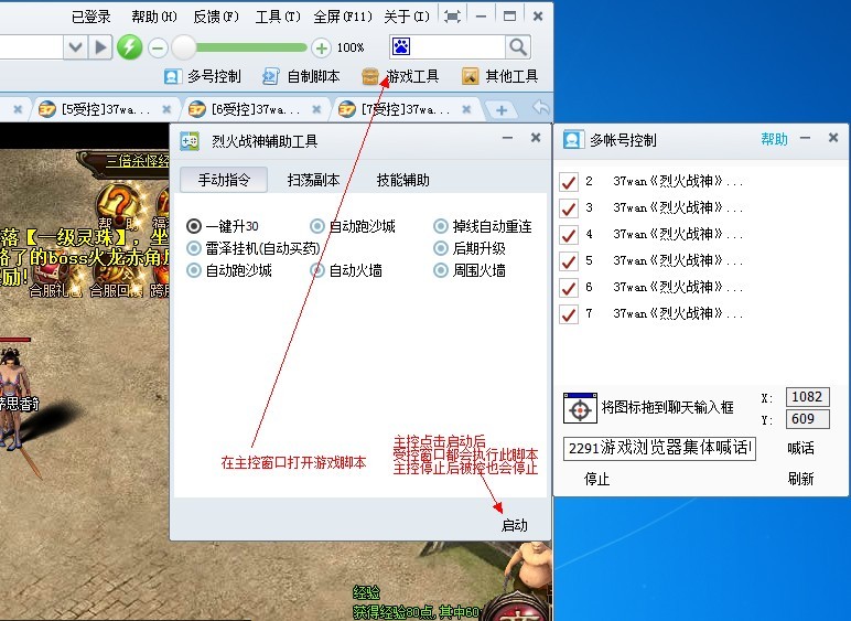 第四、多号执行脚本:切换到主控窗口,打开对应辅助工具后,所以受控都会执行此脚本, 主控停止执行脚本受控也停止执行