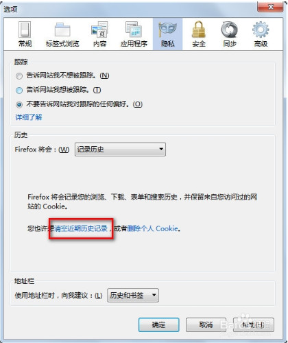 2、进入“选项”界面后点击进入“隐私”设置,点击下面的“清空近期历史记录”或者“删除个人Cookie”