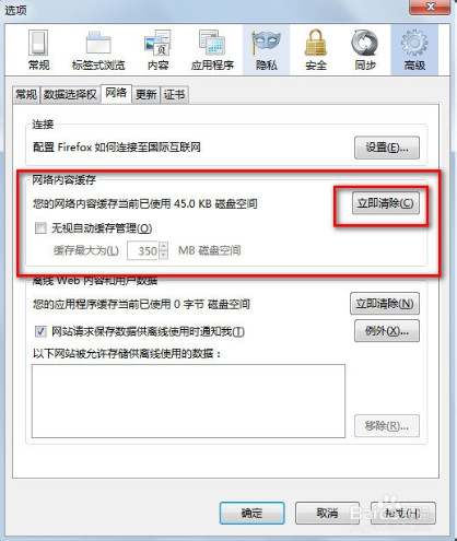 4、然后再点击进入“高级”—“网络”,在“网络内容缓存”中点击“立即清除”;如果离线Web内容和用户数据下也有需要清除的,点击“立即清除”,然后点击“确定”