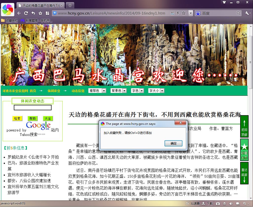 一些国产浏览器的UserAgent乱对普通用户来说还不是大问题,真正最直接影响使用就是不支持JavaScript脚本把网页加入收藏功能。许多网页提供了“收藏本页”的按钮或链接,但在许多国产浏览器中点击这些按钮或链接会提示不能收藏,只能由用户手动添加。不明真相的用户还以为是网页本身的问题。