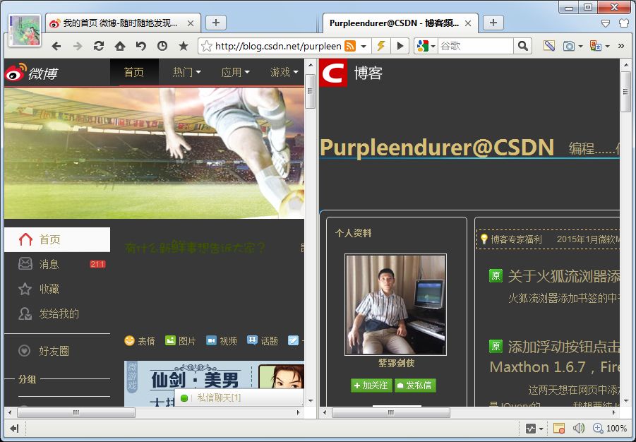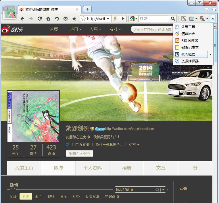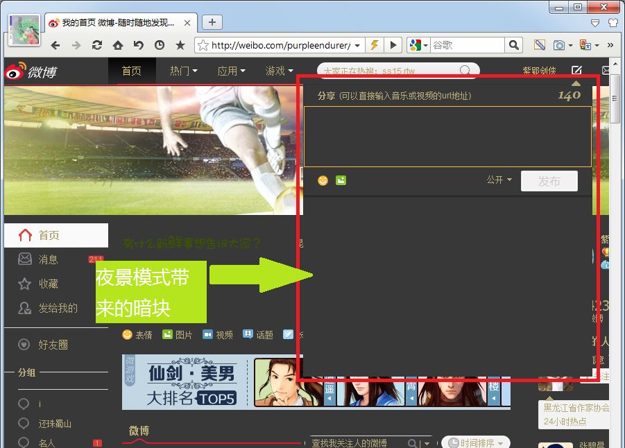 说完了这些惊喜,再提一点遗憾。就是在Maxthon3夜间模式下,一些文本输入框会显示异常。比如在新浪微博网页中,微博输入框就变得不明显了,而且会给浮动微博输入框带来暗块。