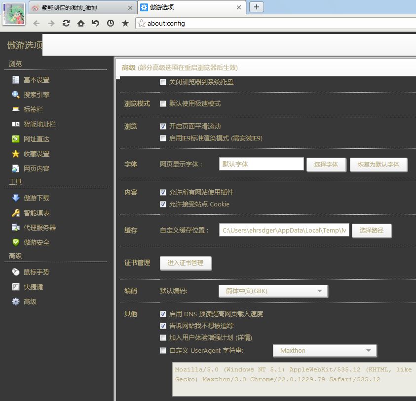 Maxthon3选项高级中可以自定义UserAgent