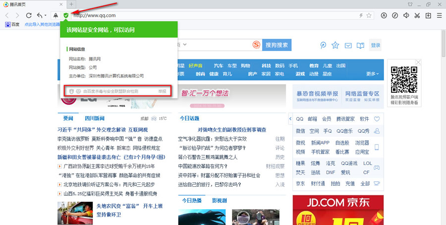 随机选取了QQ官网网站,可以看到百度浏览器清楚的标识了该网站的详细信息,并鉴定为安全