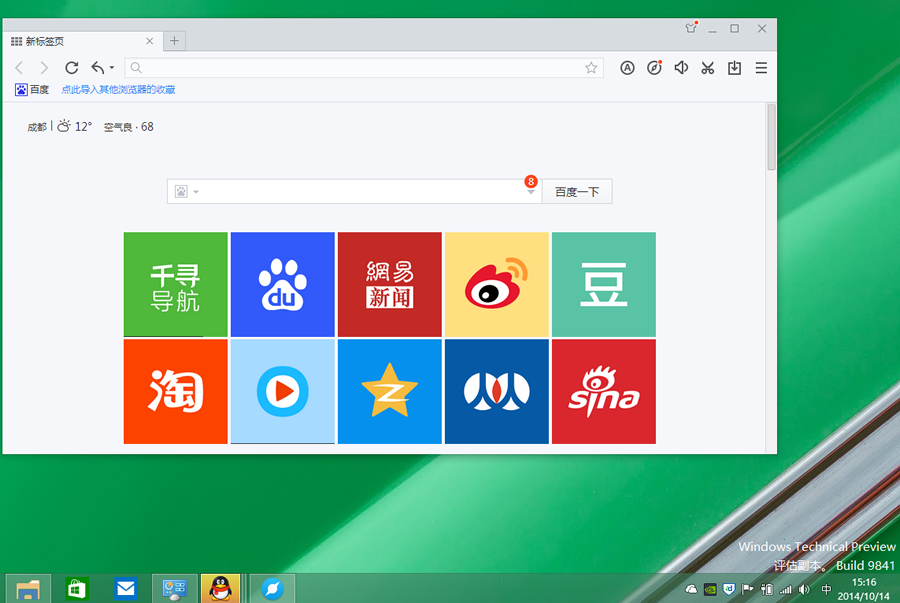 2014年10月1日,微软公司在日前的产品发布会上展示最新的操作系统Windows 10,而技术预览版中只有一个桌面版的IE浏览器,并且这个版本还不是最新的版本,这无疑让升级到Win 10预览版的用户感到失望,值得庆幸的是百度浏览器7已经完美兼容Win10 操作系统。