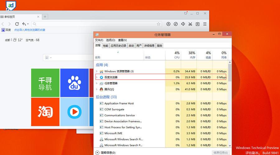 这是百度浏览器7在Win10下的占用情况,优化的非常好