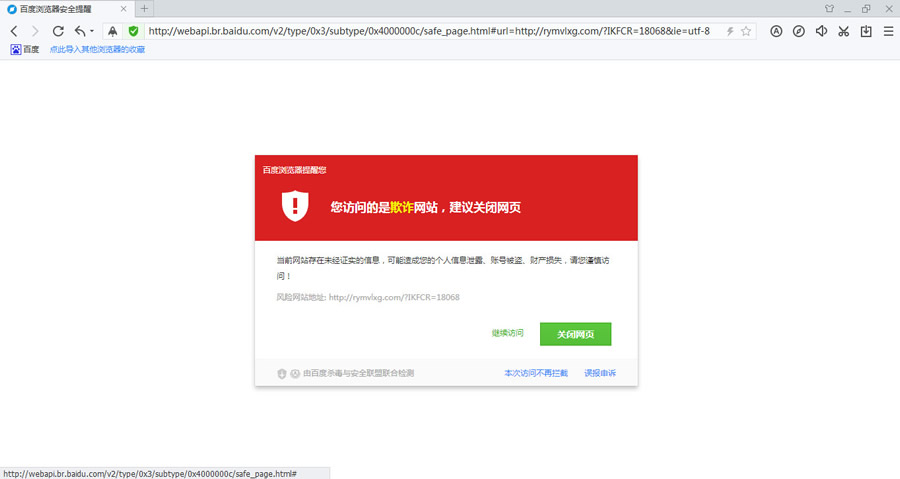 随机选取一个虚假QQ安全中心进行测试,百度浏览器精确地鉴定为危险
