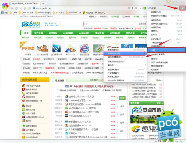 具体步骤:打开浏览器,点击最右边的扳手设置图标,下拉菜单——》工具——》管理自定义功能。如图。