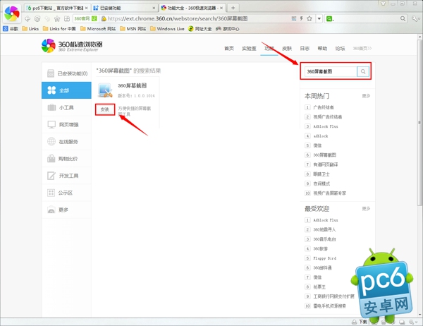 在应用页面,搜索360屏幕截图,点击安装如图: