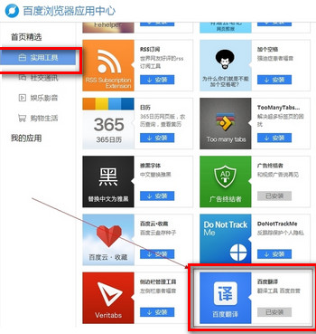 第二步:点击浏览器最右上角《小锁》,再次点击《实用工具》即可选中对网页进行英文翻译的翻译应用。然后点击安装