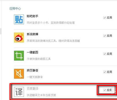 第四步:找到百度翻译(快速翻译文本和当前页面)并点启用