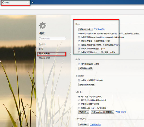 第三步:点开“设置”,它就会自动跳转到另外一个页面去,然后你就可以在这里找到隐私和安全,在隐私这里有系列的设置,自己经常使用这个浏览器的朋友可以设置看看